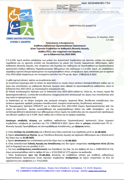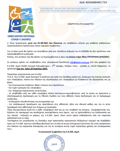 Η Ε.Α.ΟΜ. ΑμεΑ κατόπιν απόφασης των μελών του Διοικητικού Συμβουλίου και έχοντας υπόψη την κειμένη